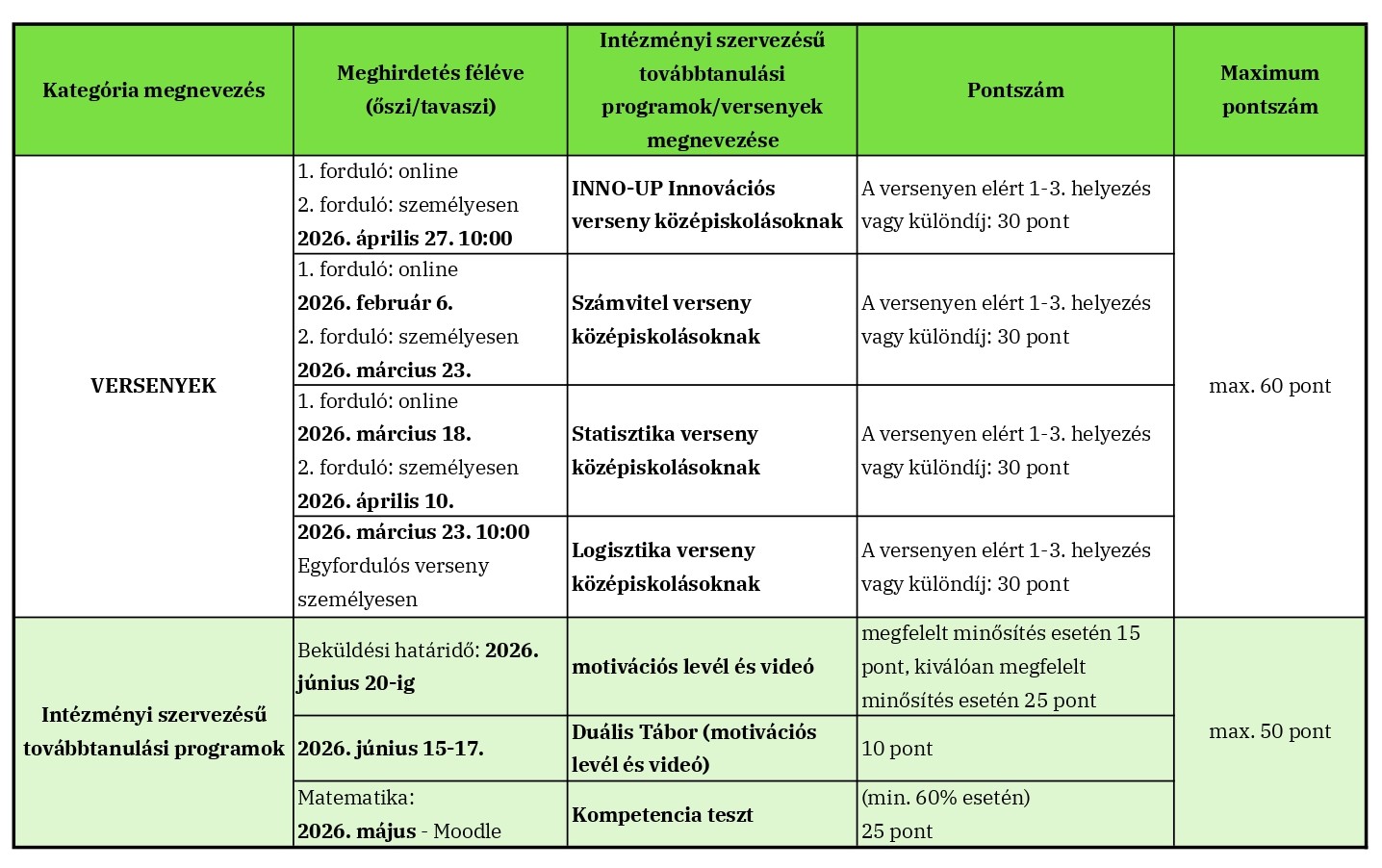 - Kategórián belül több jogcímen is adható intézményi pont, de a kategórián belül összesen maximum 50 pont szerezhető.