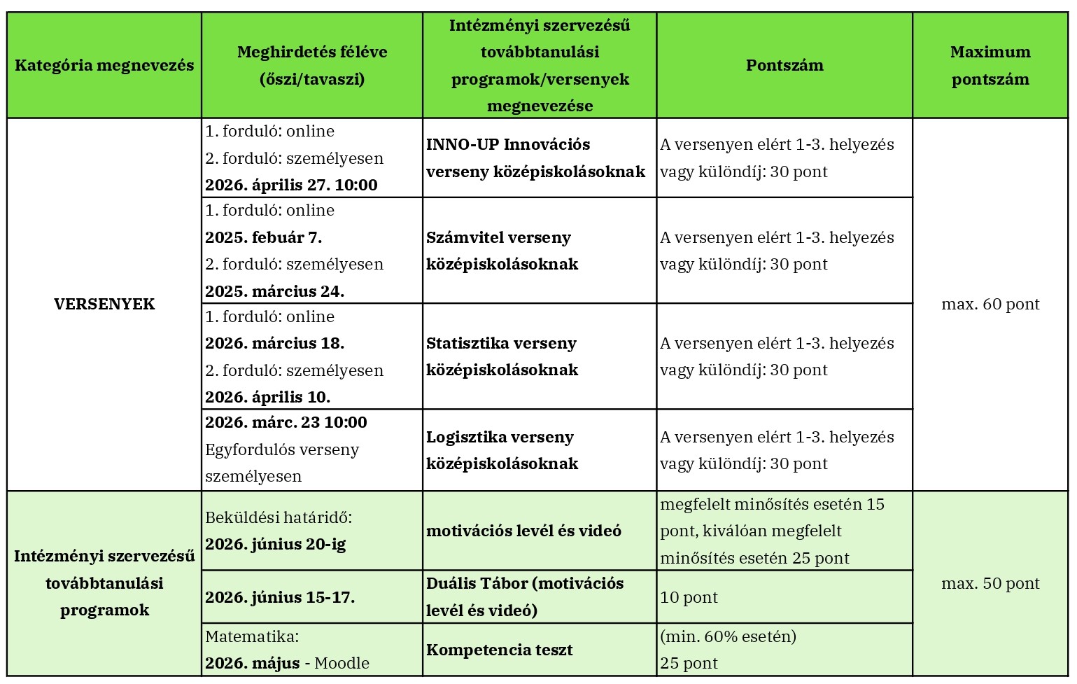 - Intézményi szervezésű továbbtanulási programokkal (7. kategória), mely során további maximum 50 intézményi pont szerezhető