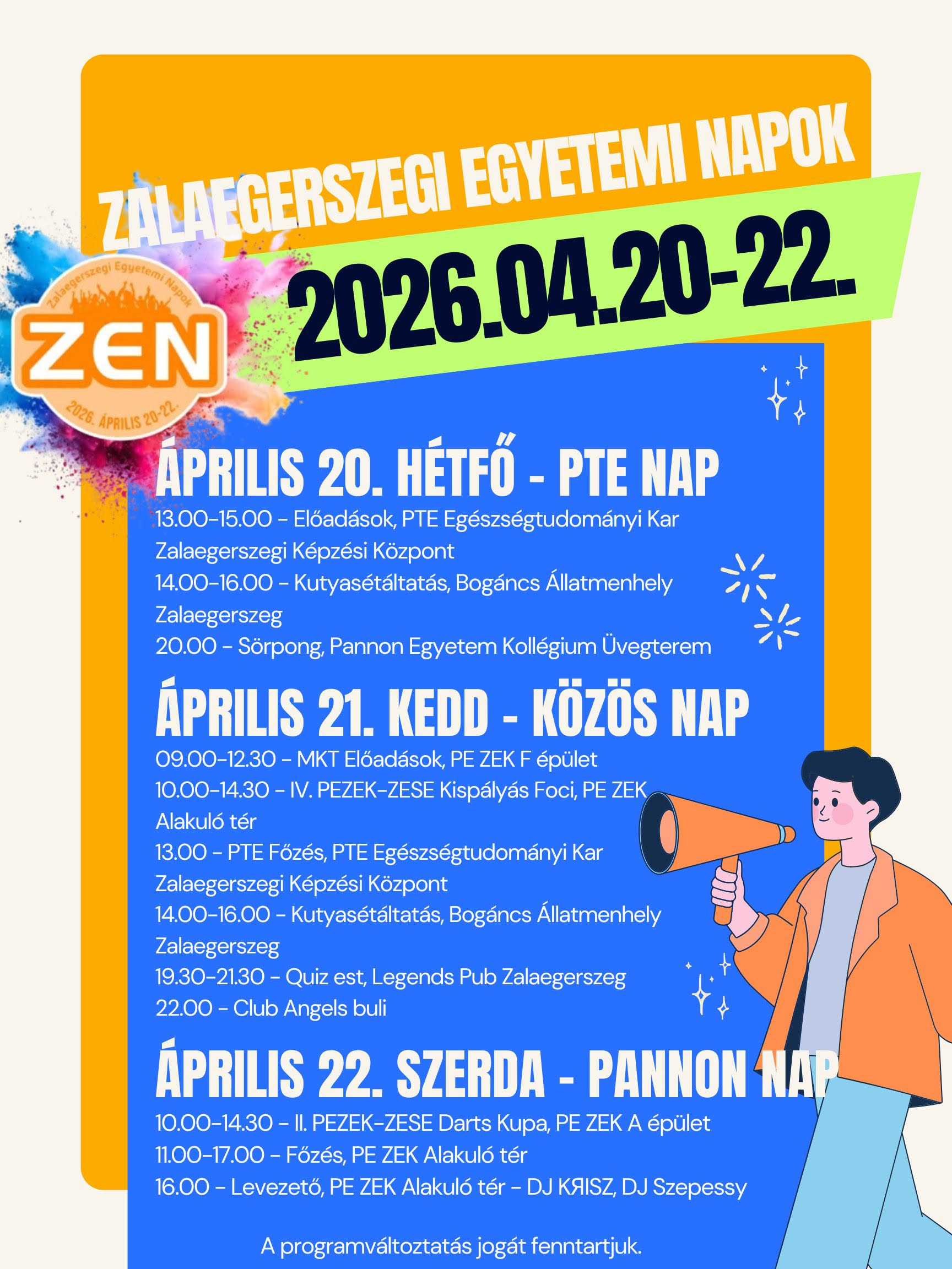 Április 20–22. között ismét megtelik élettel a zalaegerszegi campus. A Zalaegerszegi Egyetemi Napok programjai a szakmai tartalomtól a kikapcsolódásig kínálnak lehetőségeket – nappali aktivitásokkal és esti közösségi élményekkel.